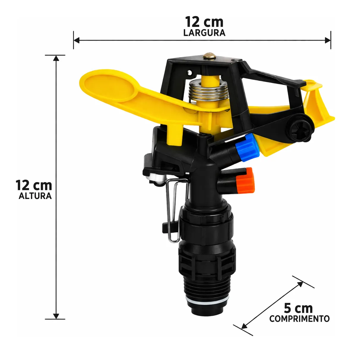 O aspersor é compacto, medindo 12 cm de altura e largura, com 5 cm de comprimento, facilitando a instalação em sistemas de irrigação com conexão de 1/2 polegada. Seu mecanismo garante a distribuição uniforme da água, otimizando o uso e promovendo a saúde das plantas.